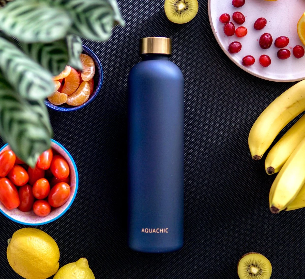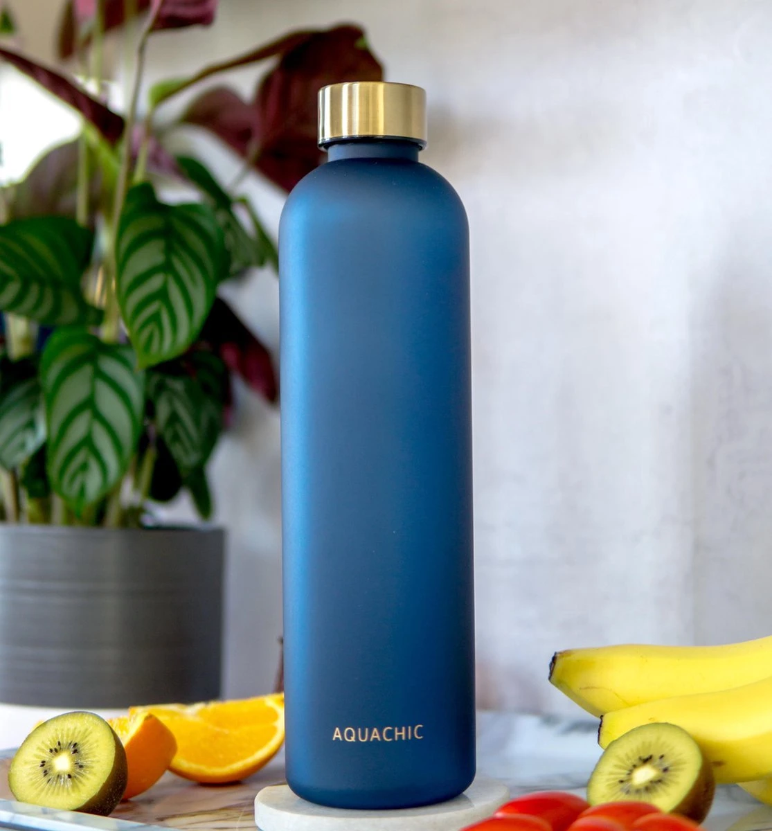 Stay hydrated in style en combineer de fles met jouw twee doppen! De fles komt standaard met gouden dop en extra donkerblauwe dop. Ons doel is om water drinken makkelijker en leuker te maken. Wij zijn Aquachic, een startend bedrijf uit Nederland. Onze missie is Nederland meer te laten drinken, op een leuke manier. De handige tijdsmarkeringen aan de zijkant van de fles herinneren je om water te drinken. And no worries, wanneer je de fles met water vult, zie je duidelijk hoeveel water erin zit desondanks de donkerblauwe kleur. Hergebruik de Aquachic fles en verbeter zo jouw ecologische voetprint. Bijvoorbeeld op het werk of school, op reis, tijdens het sporten en natuurlijk lekker comfy thuis. De fles is trouwens ook goed bestemd tegen krassen, ideaal voor on the go of bijvoorbeeld in je tas!