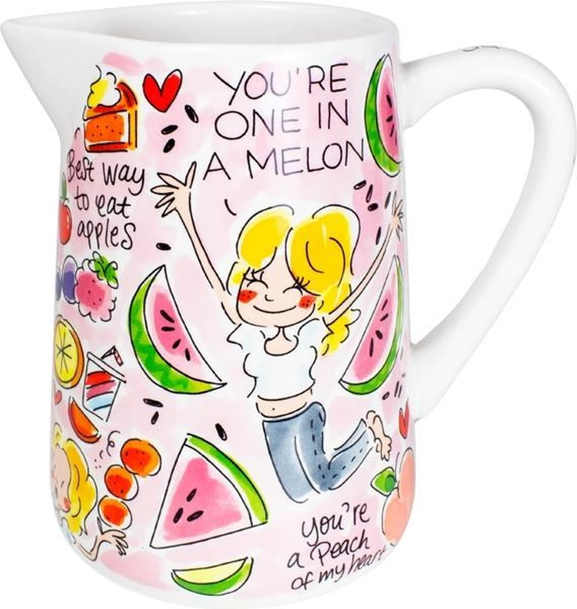 Deze vrolijke roze sapkan behoort tot de nieuwe fruit collectie van Even Bijkletsen. Deze kan heeft leuke fruitige tekstjes zoals; ‘Squeeze the day, Best way to eat apples, You’re one in a melon’. Met deze sapkan begin jij de lente gezellig en maak jij je tafel compleet.