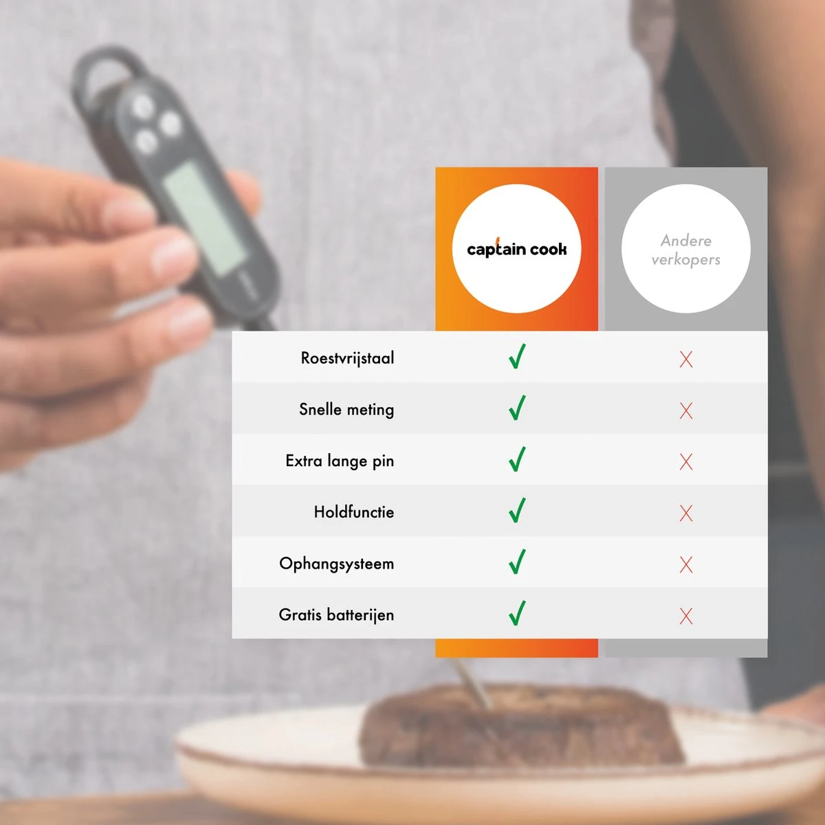 Houd jij van lekker koken of BBQ’en? Dan komt het weleens voor dat je je familie of je gasten wilt verwennen met een lekker gerecht. Maar tijdens een gezellige avond wil jij je niet druk maken over de gaarheid van je biefstuk. Met de accurate thermometer van Captain Cook meet je binnen een seconde of je gerecht gaar is. Geen zorgen meer, alleen nog maar gezelligheid tijdens je BBQ of kookavond.