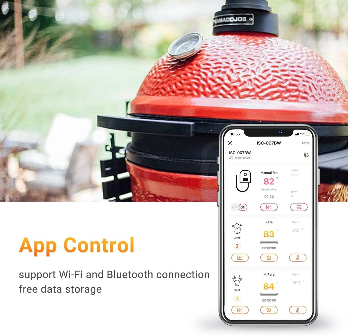 De respons van 3 sondes is snel en de temperatuur is nauwkeurig, 1 voor meting van de dometemperatuur en 2 voor meting van vleestemperatuur. Snelle nauwkeurige uitlezing en alarm – De telefoon en de temperatuurregelaar zullen synchroon alarmeren en de gebruiker waarschuwen dat het eten klaar is, wat resulteert in mals en sappig vlees.