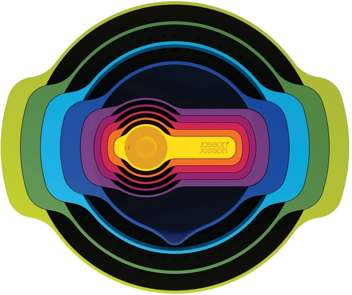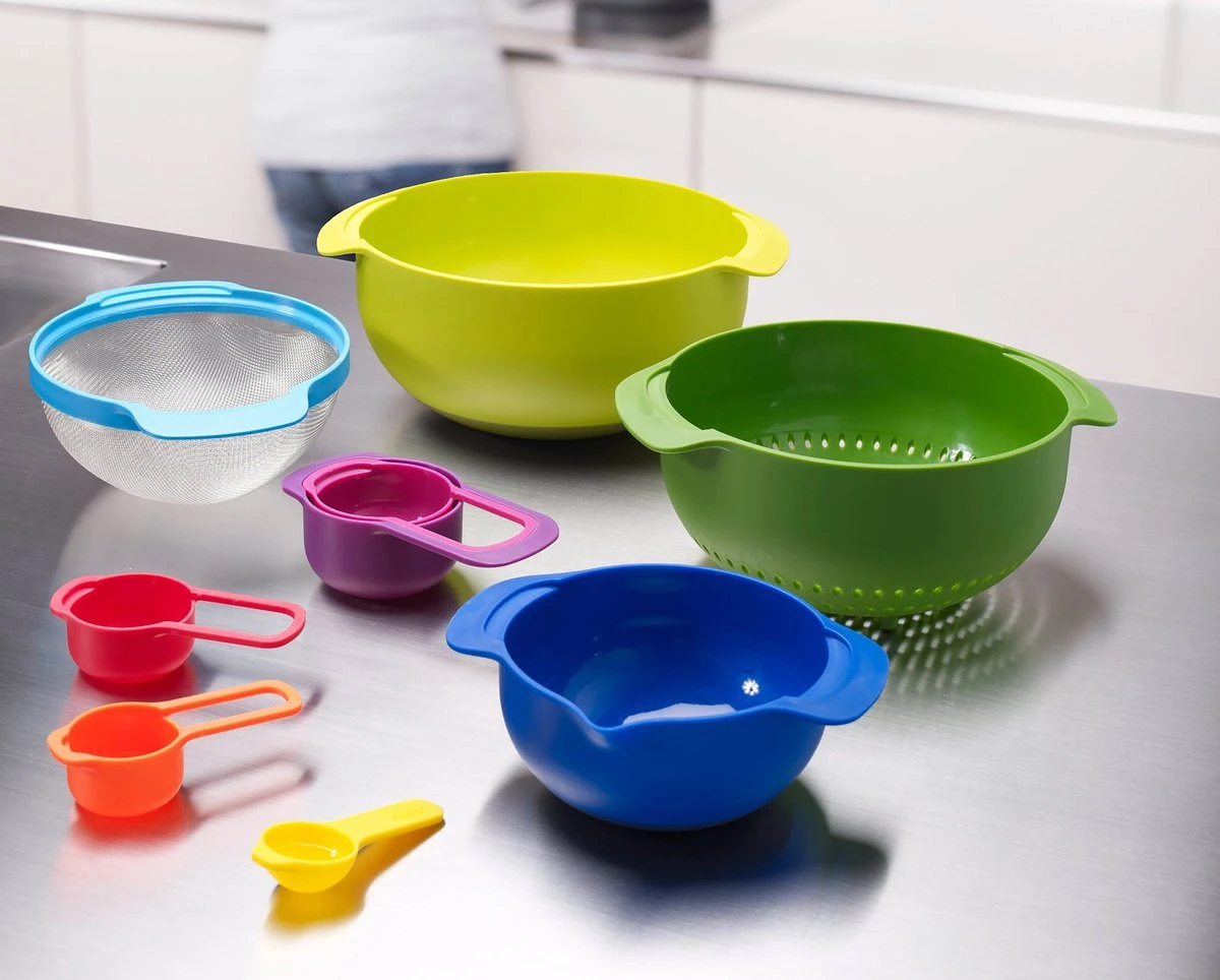 Deze 9-delige set van Joseph Joseph bestaat uit 2 mengkommen, een zeef, een vergiet en 5 maatlepels. De hele set is handig stapelbaar, bijzonder kleurrijk en bovenal erg praktisch. Al deze producten uit deze set zijn vaatwas bestendig. De inhoud: – 1x 5ml/15 ml