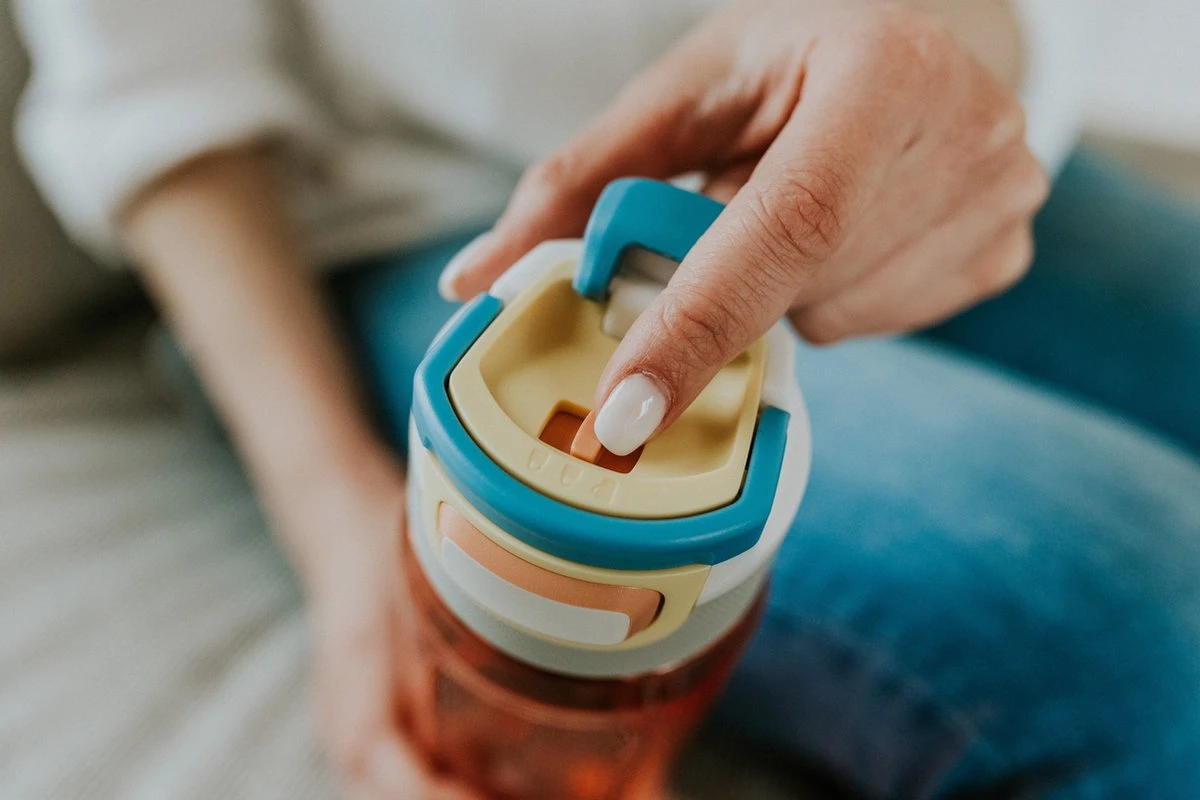 1: Druk’-positie: druk op de knop van onze drinkfles om een slok te nemen. Nooit meer morsen terwijl je haast naar de volgende meeting of al rennend je trein probeert te halen.