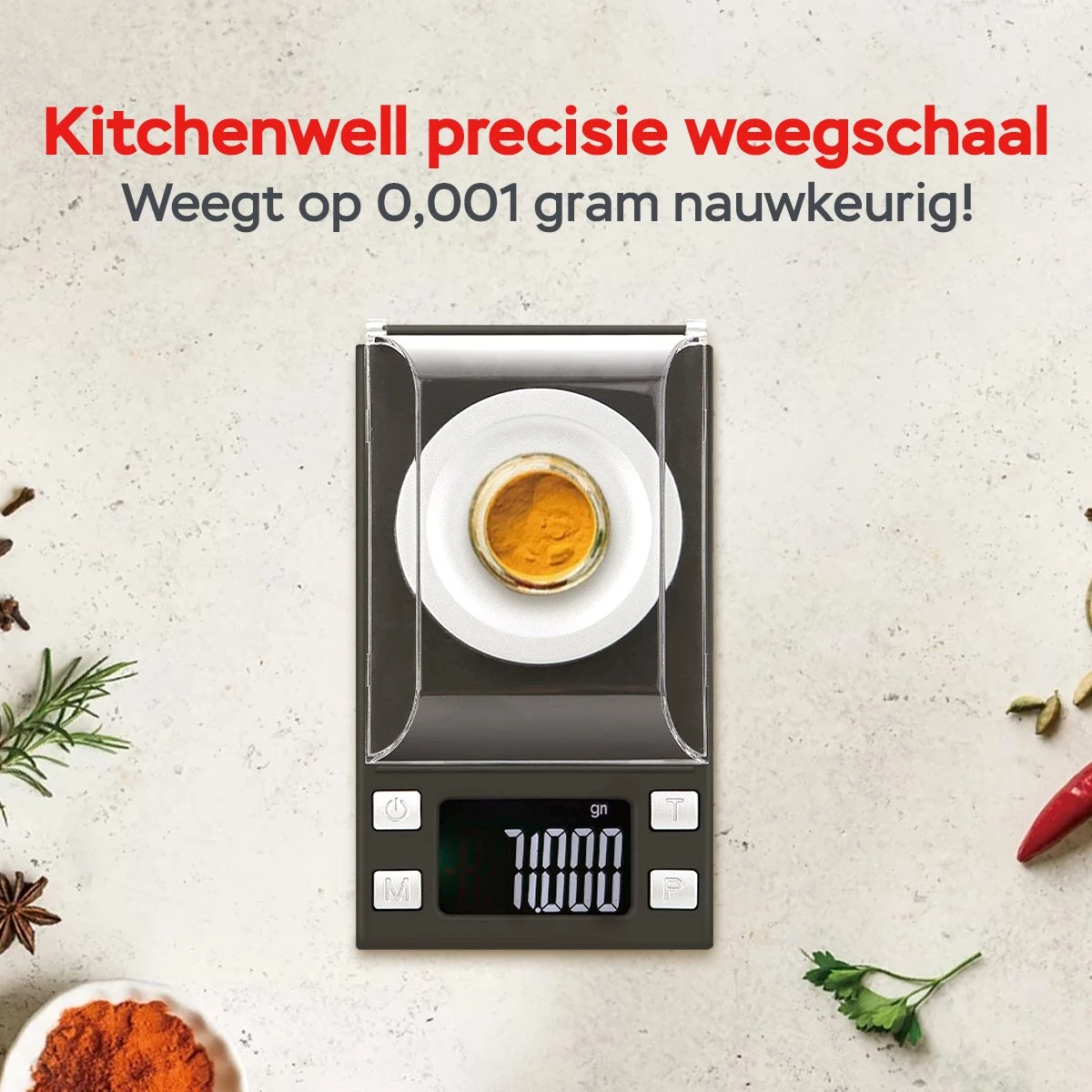 De Kitchenwell digitale precisie weegschaal is het ideale product voor in de keuken. U weegt met deze mini weegschaal gemakkelijk de juiste hoeveelheden af. Deze miniweegschaal is mulitifunctioneel en kan ook gebruikt worden om sieraden en medicatie af te wegen. Extreem nauwkeurig voor wanneer het ertoe doet, tot 100 gram