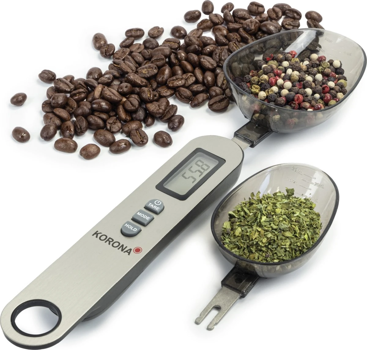 De Korona Eva is een digitale weegschaal in de vorm van een lepel die tot 0,1 gram nauwkeurig meet. Een exacte hoeveelheid afwegen is nog nooit zo snel en eenvoudig geweest. Te gebruiken voor kruiden, koffie thee of olie