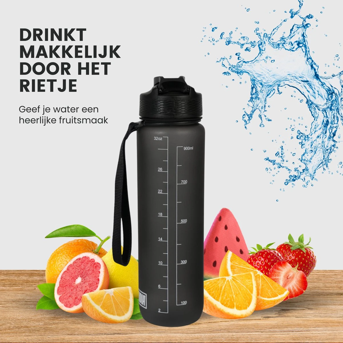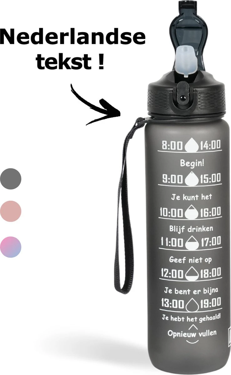 Met een Grijze Motivatie waterfles met rietje drink je altijd genoeg water