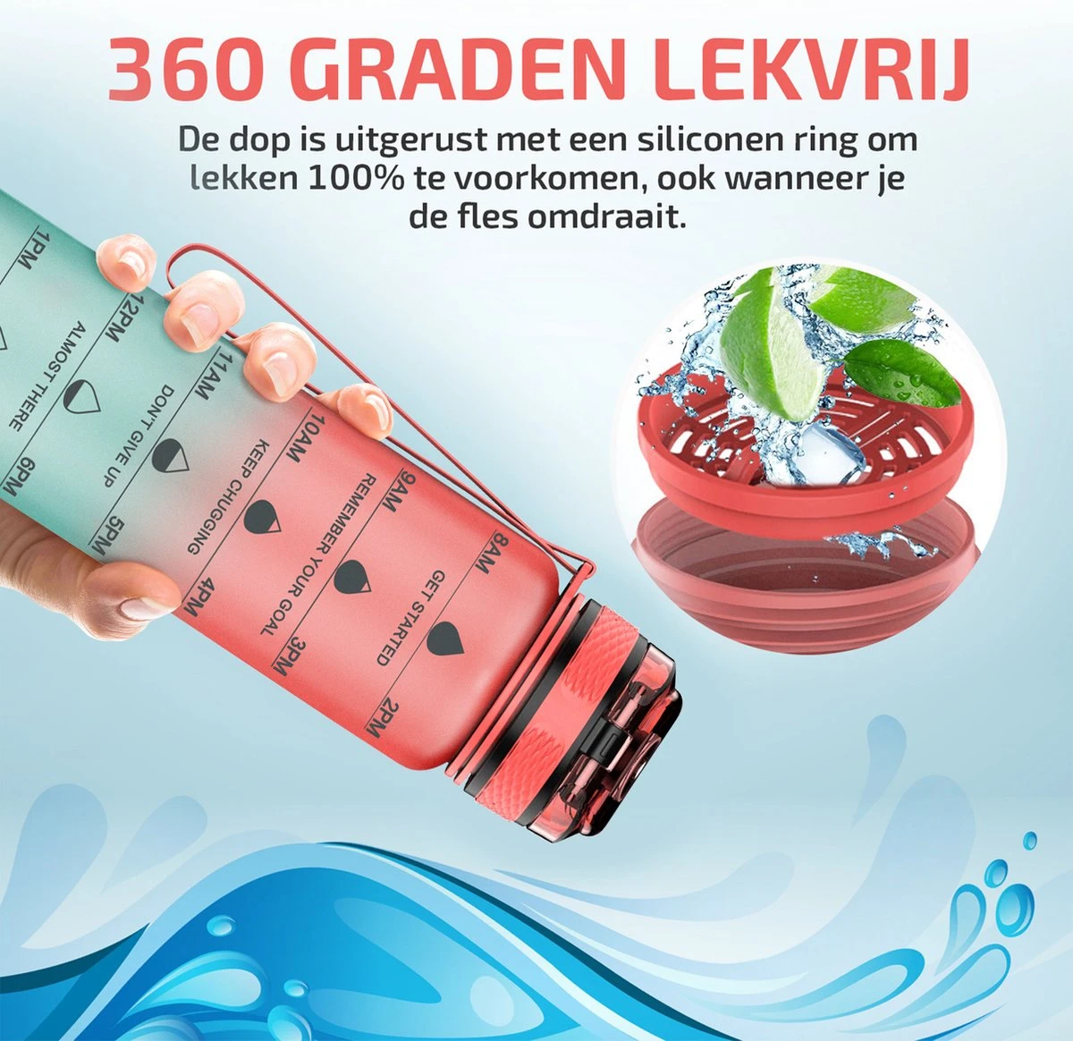 Wil je meer water drinken maar vind je het lastig om je daaraan te houden? We weten allemaal dat water goed voor ons is. Toch drinkt 75% van de mensen te weinig water. Laat je motiveren door water te drinken uit de juiste waterflessen! Met de Lekro 1 Liter drinkflessen drink je met gemak de aanbevolen dagelijkse hoeveelheid water. De fles heeft een snelle waterstroom en klik je binnen een handomdraai open. Houd jezelf scherp via de tijdsmarkeringen. Of maak je water smaakvol met fruit! Het fruit filter houdt alle fruitresten tegen. Vul de fles 2x per dag en je zit al op de aanbevolen dagelijkse hoeveelheid water!