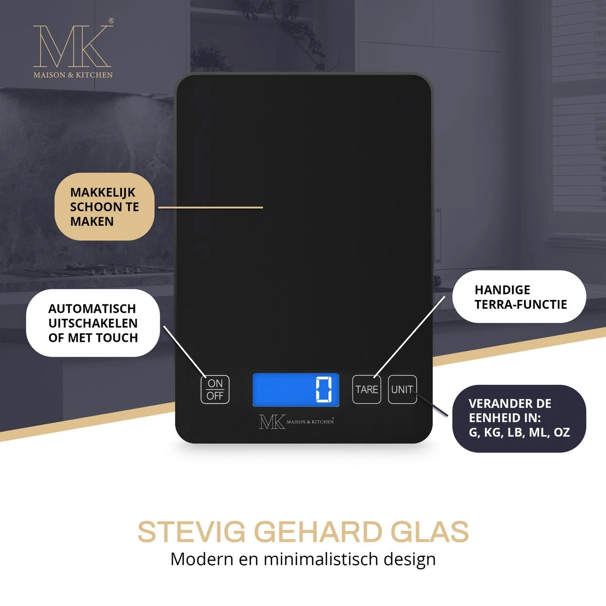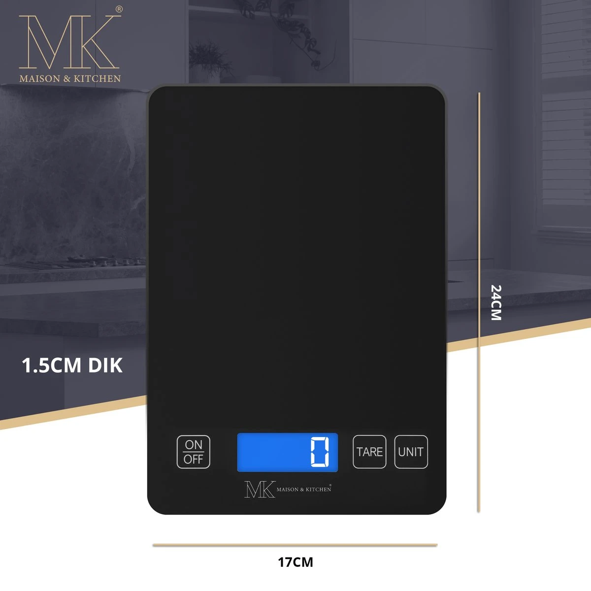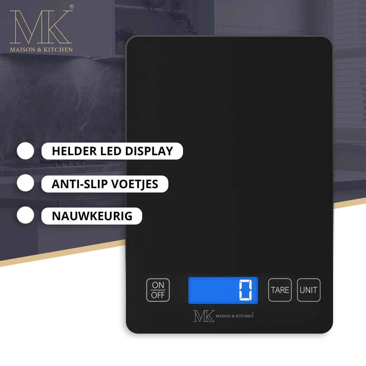 Hou jij van Koken? Weeg nauwkeurig het juiste aantal van uw favoriete recepten. Of het nu gram, ons, pond of milliliter is, MK weegschalen kunnen het! De keukenweegschaal is uitgerust met een gemakkelijk af te lezen LCD-display en tarrafunctie en schakelt automatisch uit na 2 minuten om de batterij te sparen. Een echte musthave voor iedere keuken!
