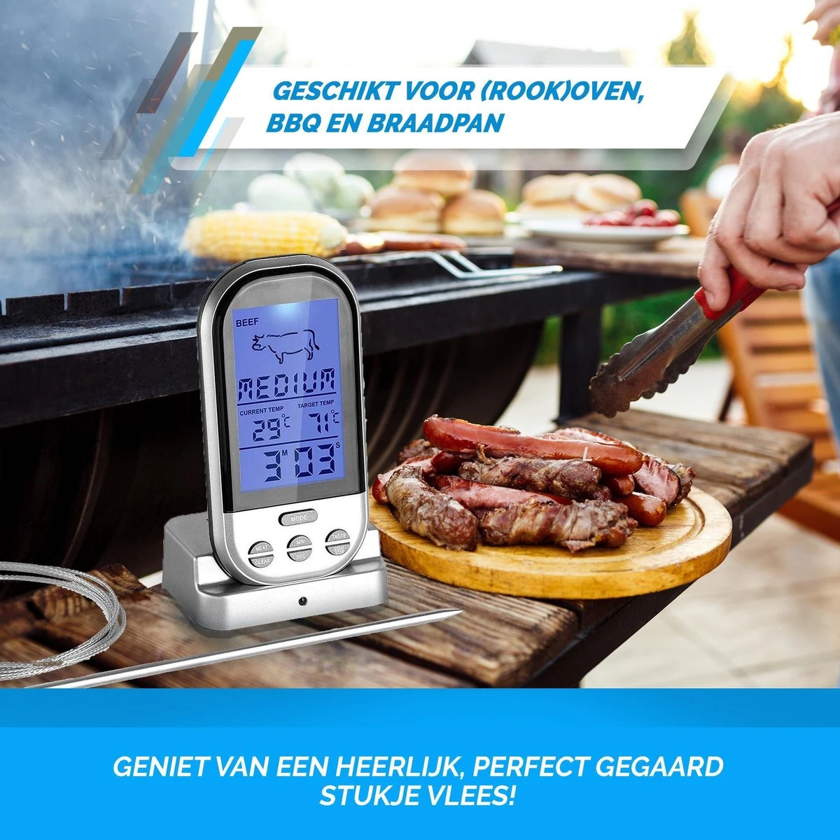 Vind je het lastig om jouw stukje vlees goed gaar te krijgen? Deze draadloze vleesthermometer is perfect om de kerntemperatuur van vlees te meten en naar persoonlijke smaak te bereiden. De kookthermometer werkt binnen een straal van ca. 20 meter. Je hoeft het vlees dus niet continu te checken, want je krijgt vanzelf een seintje wanneer het vlees klaar is. Het heldere display geeft de temperatuur weer. De oventhermometer meet tot 250°C/500°F. Geschikt voor oven, bbq en braadpan.