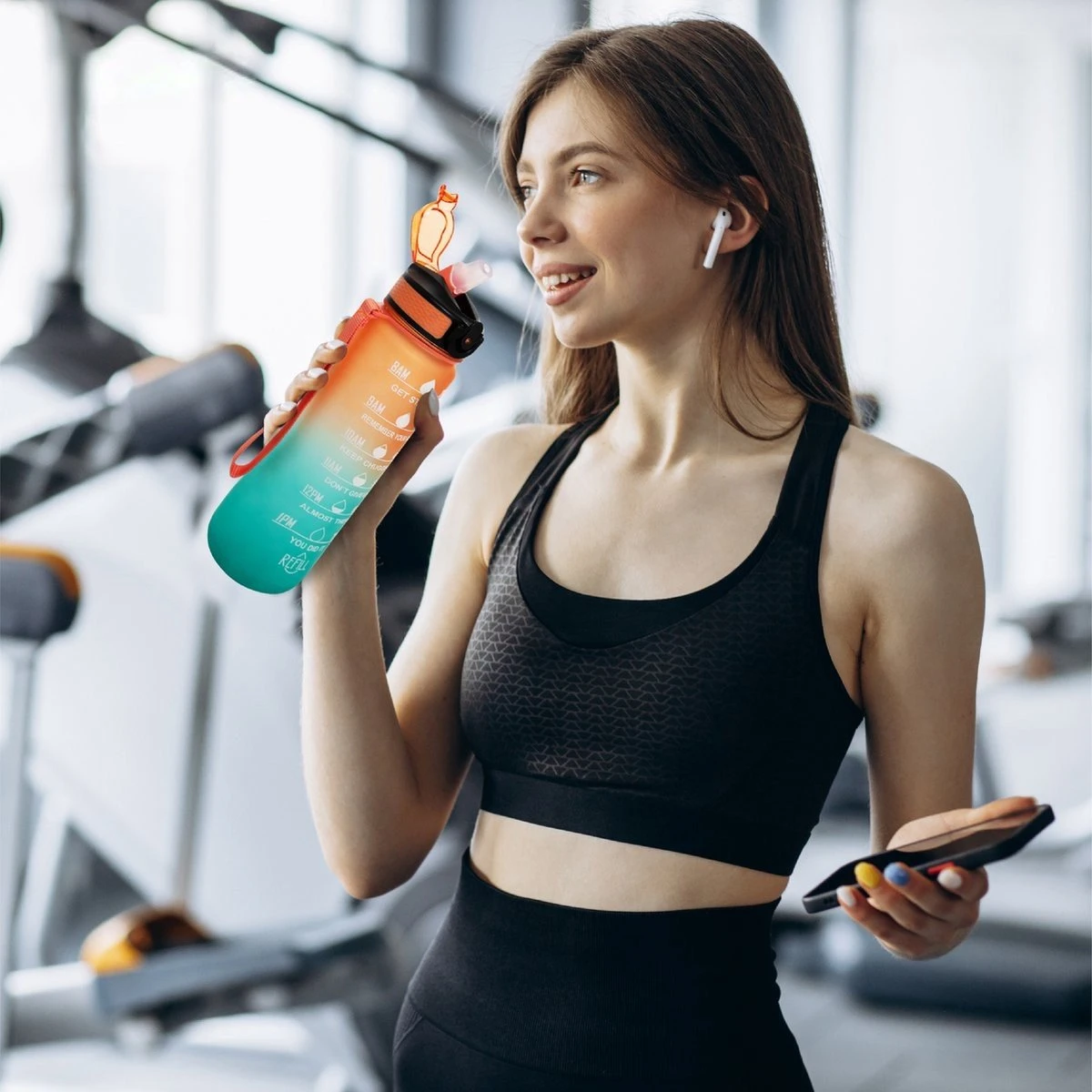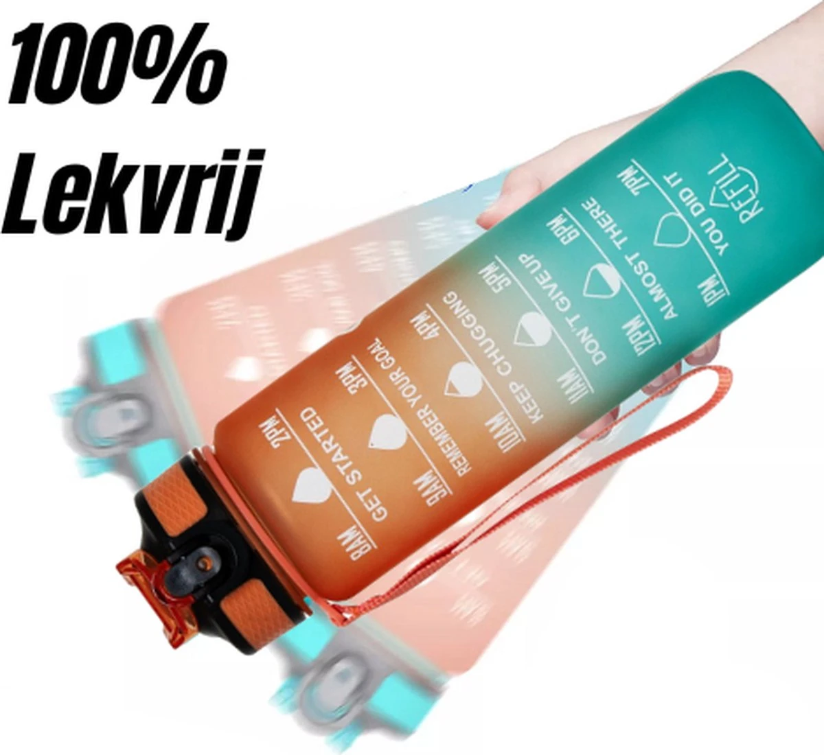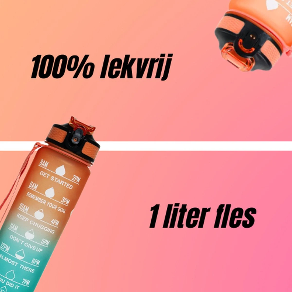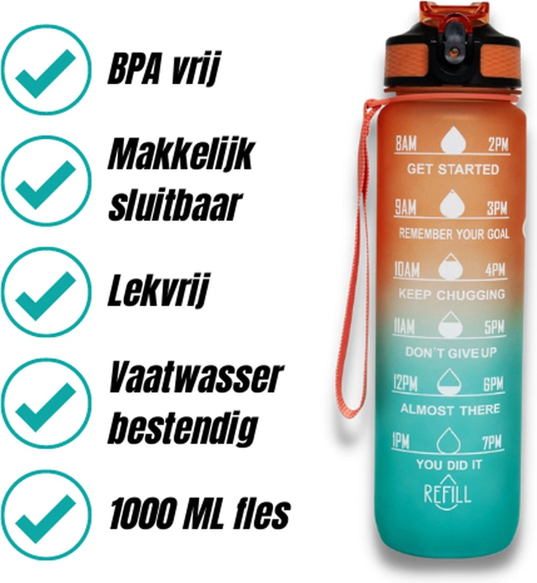 Drink jij wel genoeg water? Met de waterfles zorg jij dat je iedere dag de juiste hoeveelheid water drinkt! De motivatie waterflessen zorgen er namelijk voor dat je elk uur genoeg water drinkt. Hierdoor zal je meer energie hebben gedurende de dag. Met een inhoud van 1000 ml hoef je de fles maar 2 keer te vullen. Daarnaast is de water fles geschikt om mee te nemen naar fitness, werk, school of andere gelegenheden.