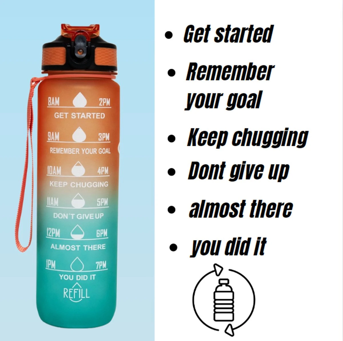 Met de meegeleverde draagriem maak het je makkelijker om hem overal mee naar toe te nemen. Onze motivatiefles is ook geschikt om in de fietshouder of in de auto in te stellen. Perfect voor het hardlopen, wandelen, fietsen, kamperen, reizen, fitness of andere gelegenheden. handig toch?