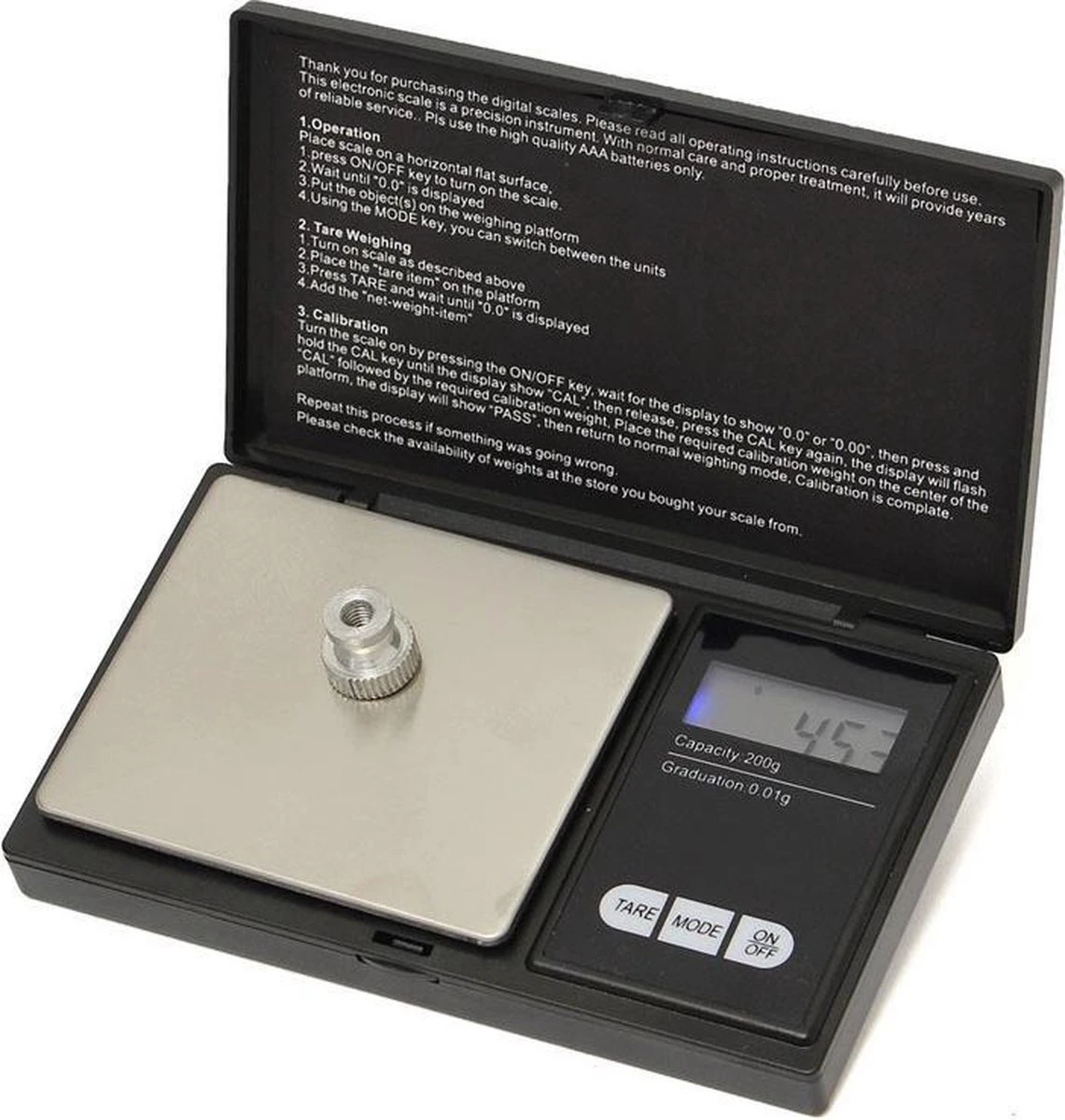 Deze weegschaal kan tot 200 gram meten met een nauwkeurigheid van liefst 0,01 gram. Het weegplatform is gemaakt uit solide roestvrij staal en heeft een relatief groot oppervlak gemeten na de afmetingen van de weegschaal. Hierdoor kunnen ook grotere voorwerpen eenvoudig worden afgewogen en worden afgelezen op het LCD display met achtergrondverlichting.