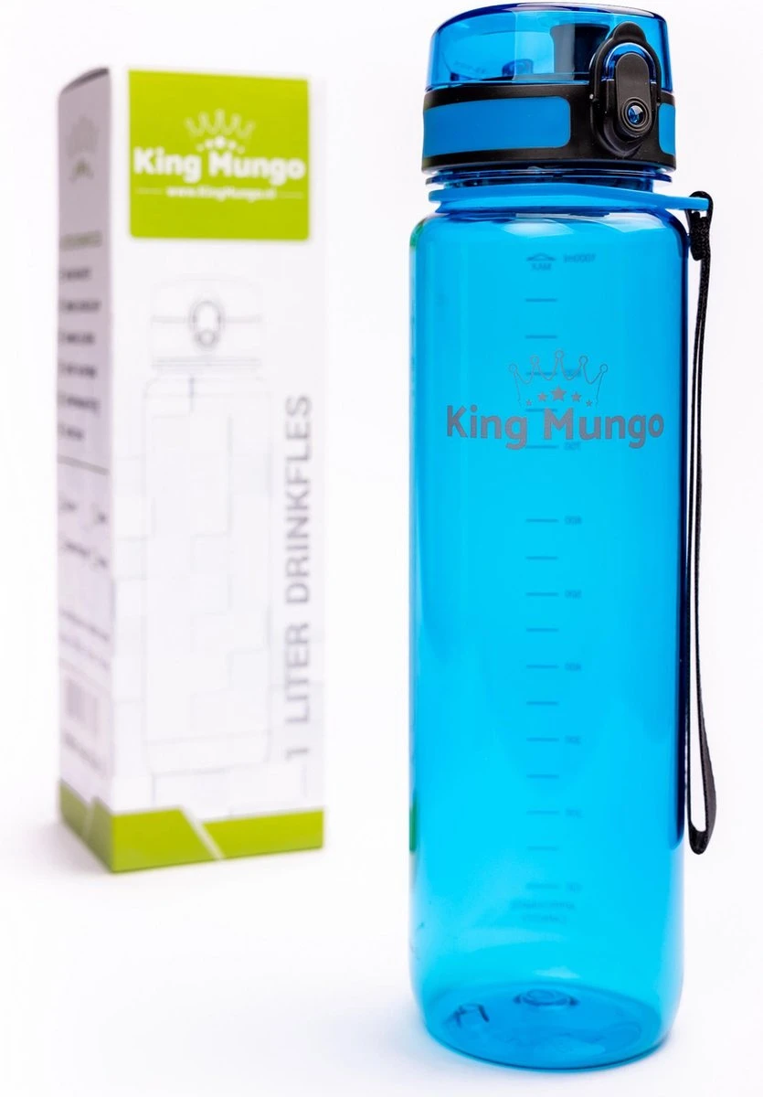 Waterfles 1 liter van hoge kwaliteit. Lekvrij en zeer comfortabele grote 1 liter drinkfles / bidon / drinkbus voor dagelijks gebruik op kantoor of tijdens het sporten. Een uniek sluitmechanisme, vergrendel de dop zodat de grote waterfles niet lekt in je tas. Deze herbruikbare duurzame blauwe King Mungo design waterflessen zijn BPA vrij (veilig en geen plastic smaak aan het water). Verkrijgbaar in diverse nettte enkele kleuren, zonder allerlei ‘motiverende teksten’ en ’tijdmarkeringen’, ook zonder zul je met deze fles voldoende drinken!